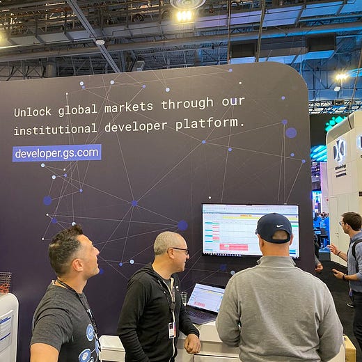 Every Fortune 500 is a tech company, GS with a booth at AWS re:Invent and announcing the launch of developer.gs.com. In fact, most forward thinking Fortune 500s have developer.fortune500.com like JPM Chase, Walmart, and Citi. More on GS and their partnership with AWS.