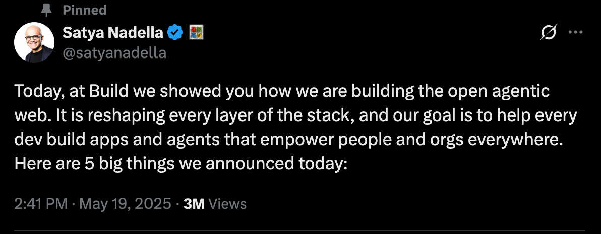 Not to be outdone, Satya covers the big theme at BUILD - to be the platform where developers build the open agentic web!