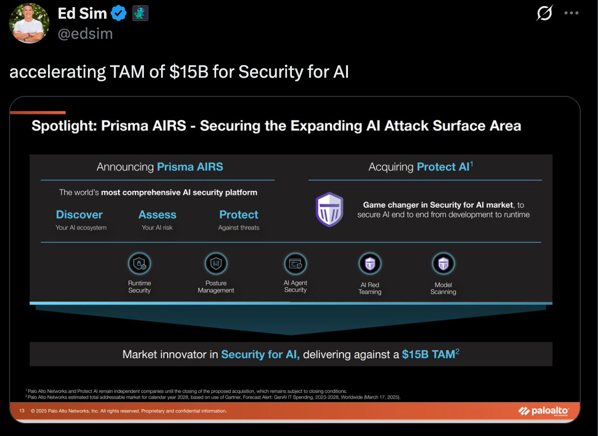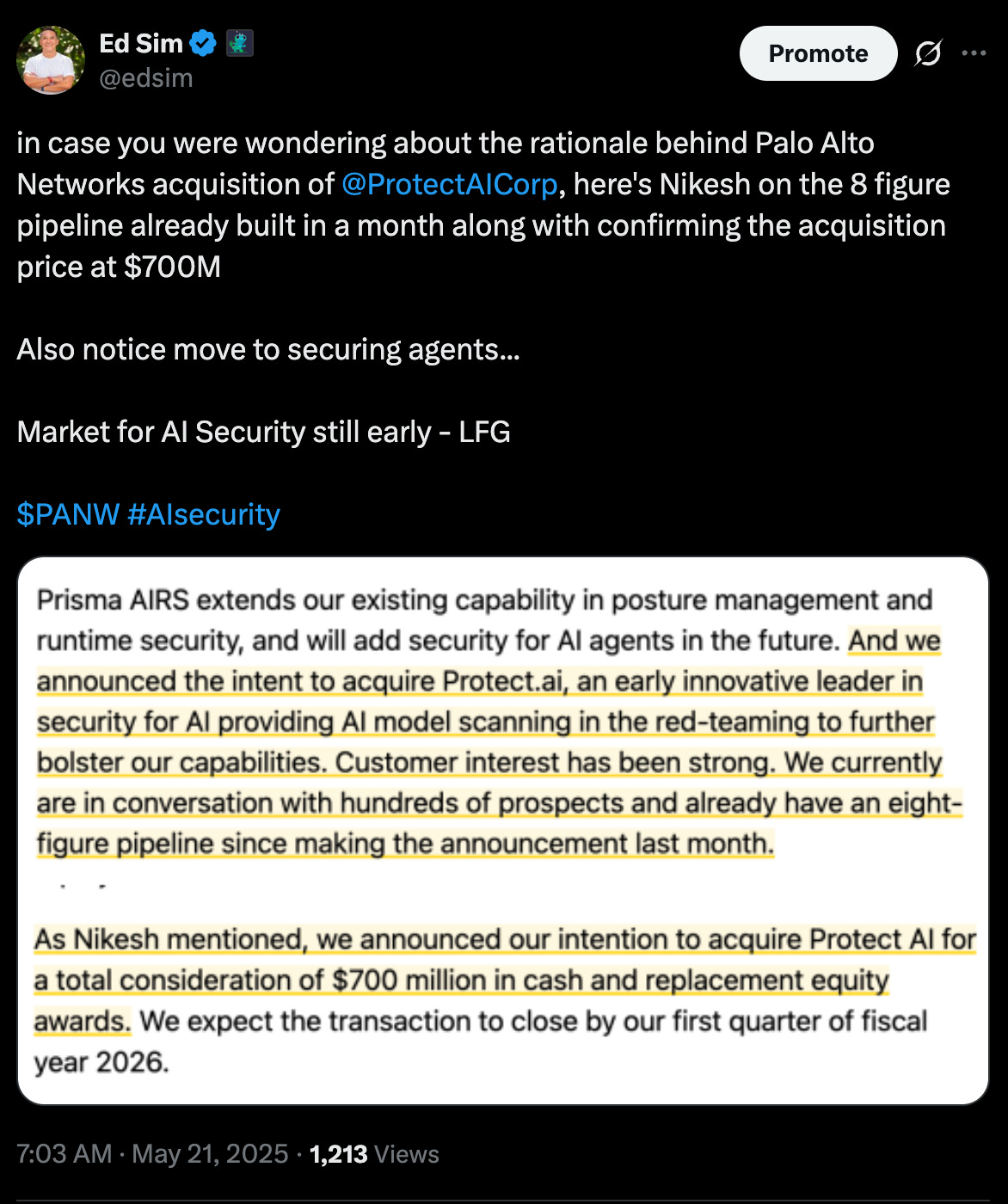 #Palo Alto Networks revealed the acquisition price for portfolio co Protect AI - $700M 🤯 - more on why and the opportunity ahead! Also Elad Eraz has a great breakdown of the PANW quarter on this LinkedIn post