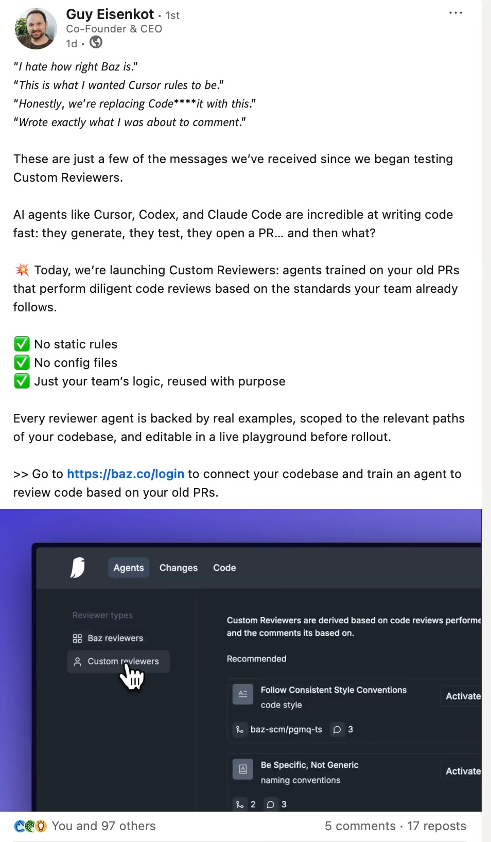 Welcome Baz agent (a portfolio co) - your custom reviewere based on YOUR codebase and PRs and finetuned by you over time