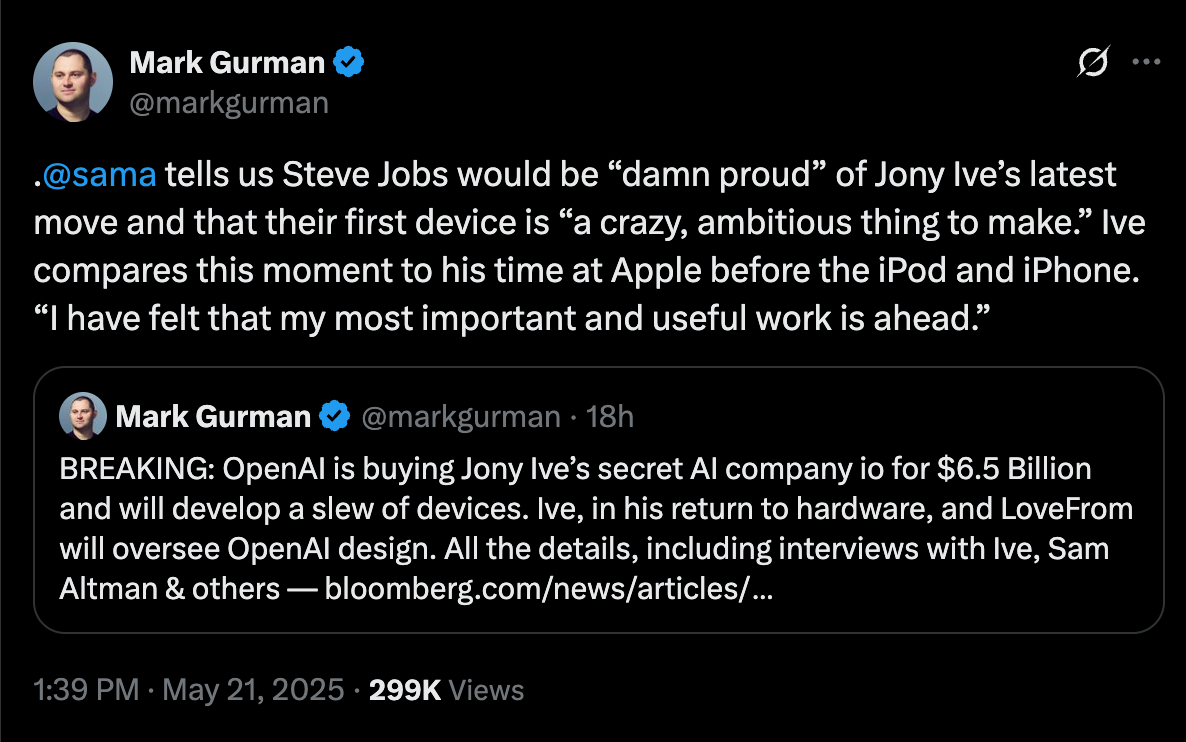 Back to OpenAI - this is how you win big - fusing software, hardware, physicists, engineers and leaders…Essentially OpenAI paying $6.5B for the acquihire of a 55 person team per Axios.