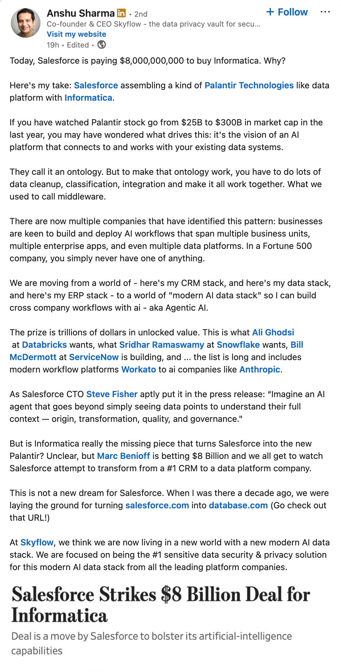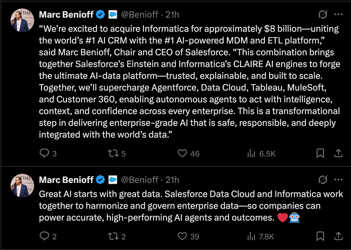 #Huge news - Salesforce finally buying Informatica - for $8B, down from $11B a year ago - with revenue of $1.66B the multiple is around 4.8x trailing as its only growing 2.8% per year - Anshu has best post on the why now