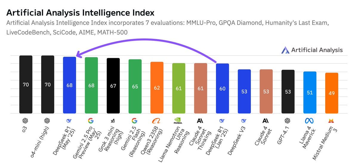 🇨🇳 China remains neck and neck with the US: models from China-based AI Labs have all but completely caught up to their US counterparts, this release continues the emerging trend. As of today, DeepSeek leads US based AI labs including Anthropic and Meta in Artificial Analysis Intelligence Index