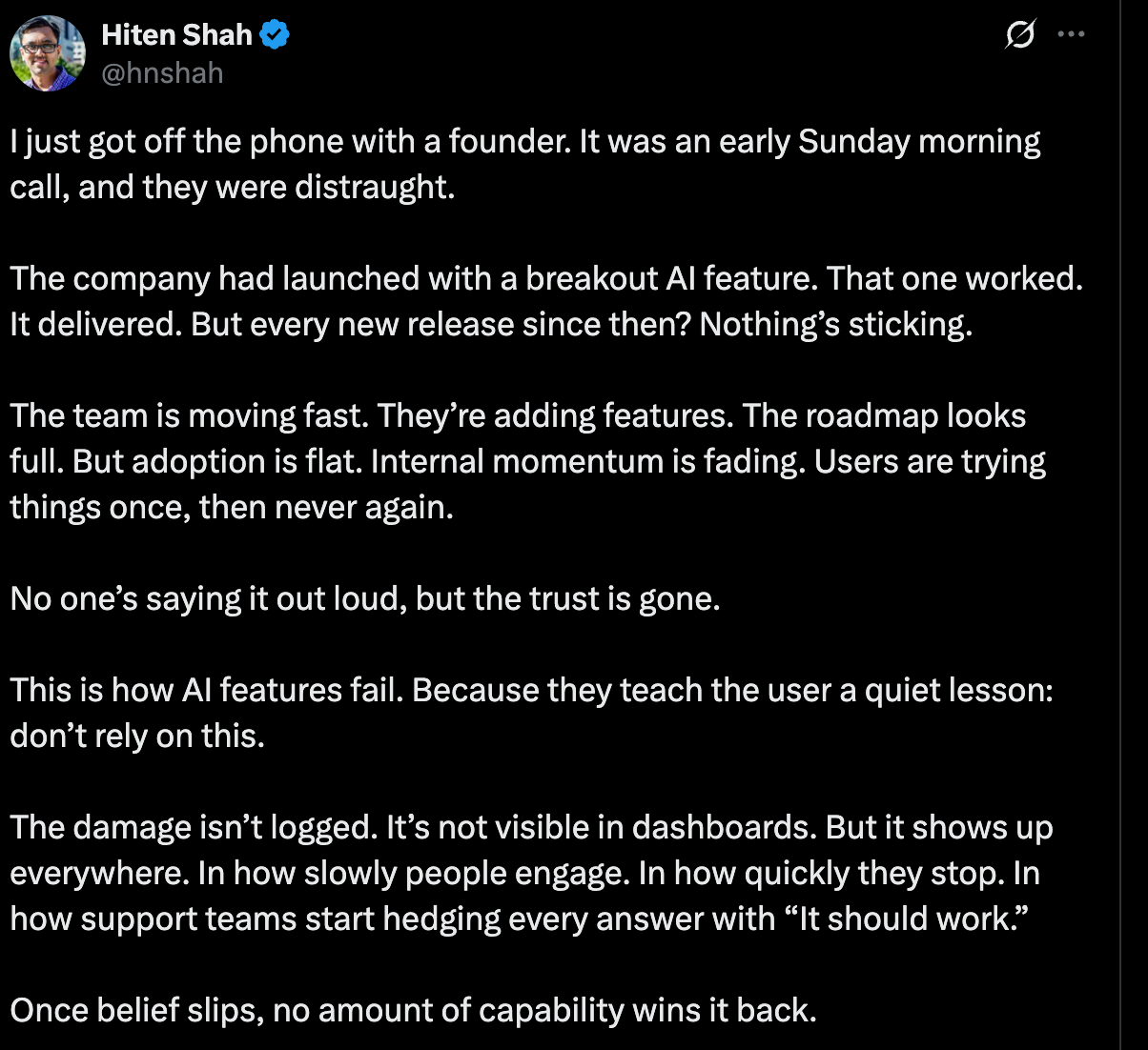 Well readers, this exactly is why zero stage startups who are unencumbered have the opportunity of a lifetime even when incumbents have large data moats etc. This is not the same for every single industry or company, but founders, realize that your chance is still here - lots of talk about AI from the large cos but still very few all-in.