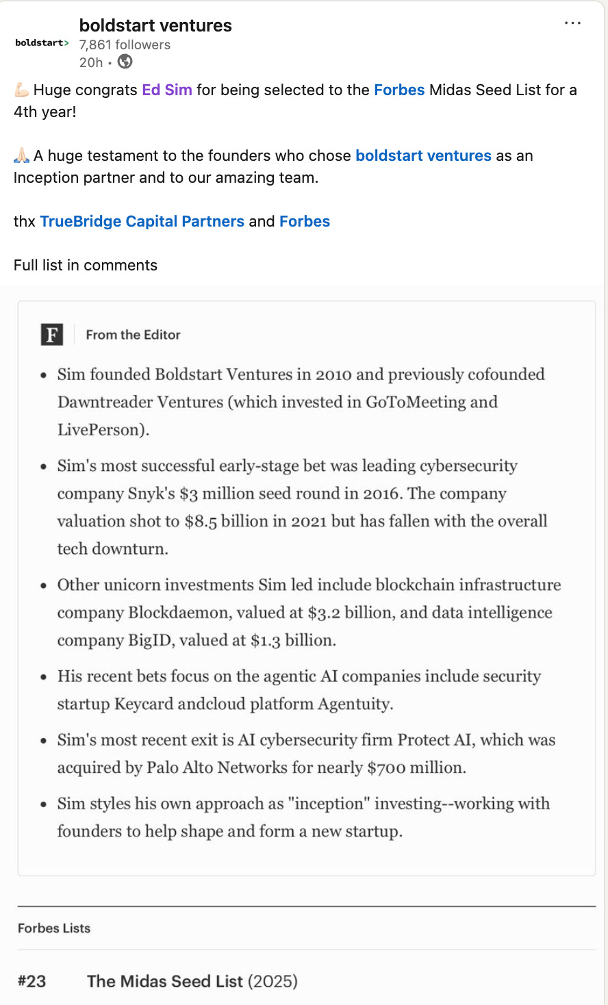 #Year 4 on the Forbes Midas Seed List of top seed investors in the world! 🙏🏻 for the amazing founders I’ve had a chance to partner with and the team at boldstart (👇🏻 click for full list)