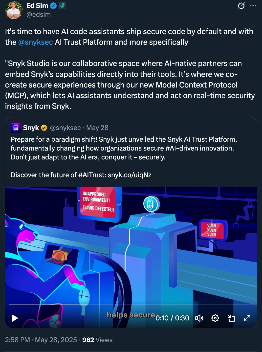 #congrats Snyk (a portfolio co) on launch of the first AI Trust Security Platform - secure coding has to start by default and Snyk is here for developers from the IDE all the way to deployment (👇🏻 click for video)