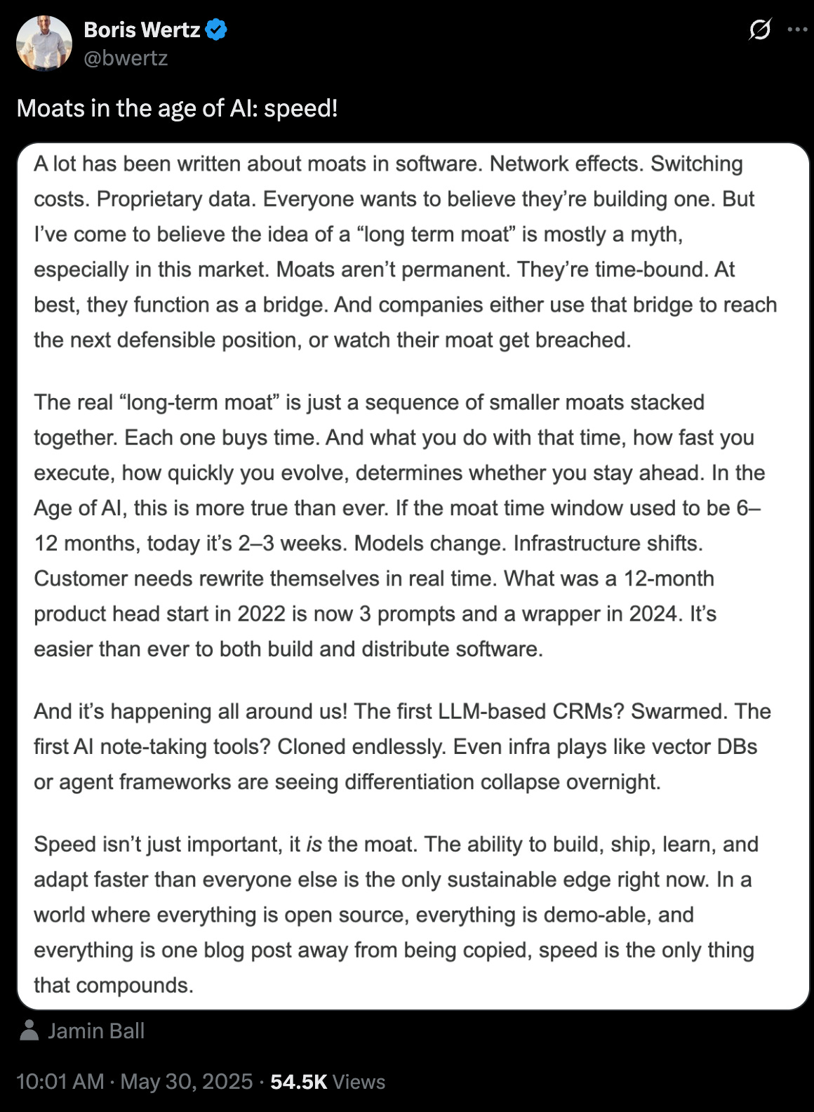 Every day I read that you have to "just ship;" "keep grinding;" "no more moats;" "speed is the only moat; "competitors will copy your features and vaporize what you just shipped..."