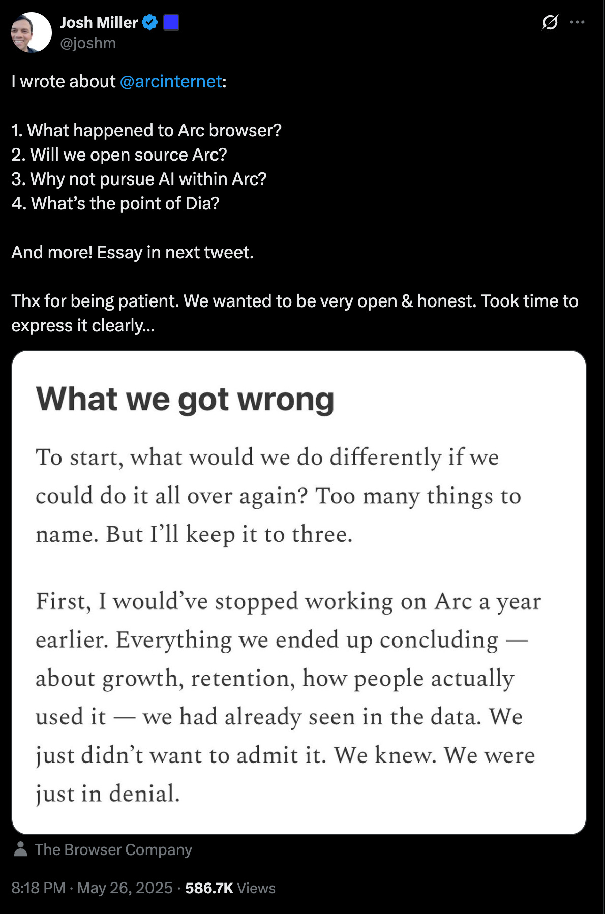 #must read story of pivoting, how Arc browser wasn’t getting the signals, went AI native, and why a completely separate product