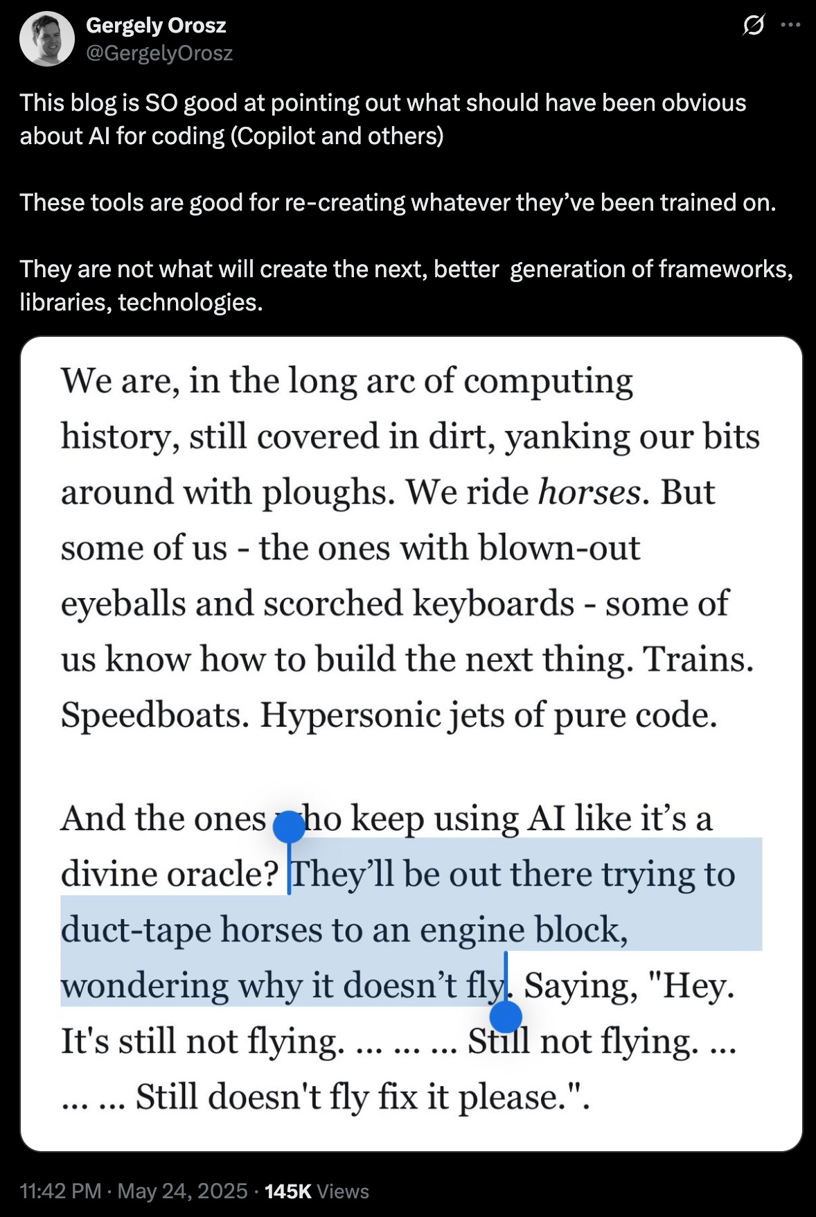 Let me see if I have this right: the only path to success left now is to build a high-speed software engineering machine that ships features almost daily. Forever. Anything short of that will fail (and take investor money with it). Is that it?