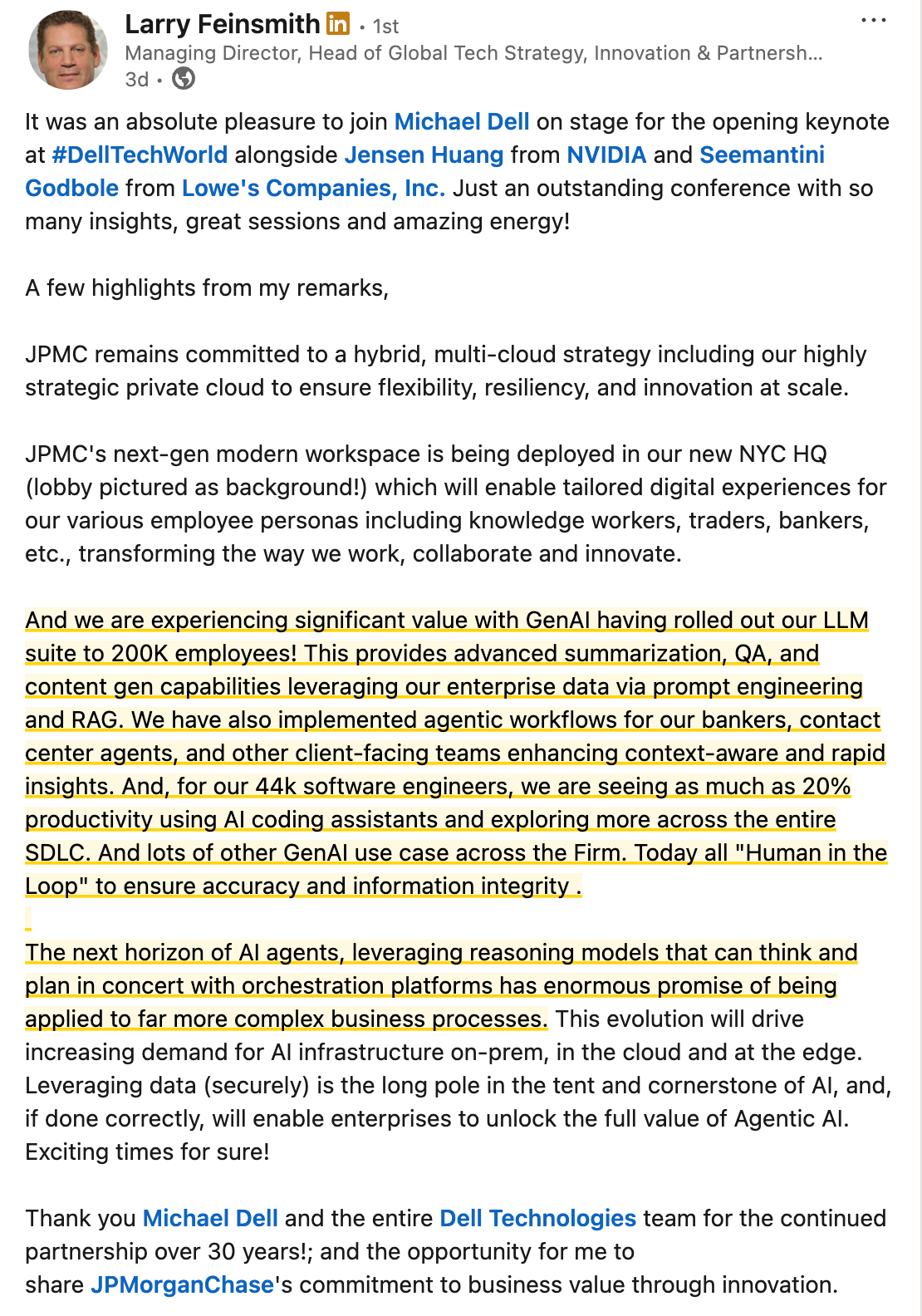 #more on how far along JPM is on AI and what’s the future for agents (Larry Feinsmith)