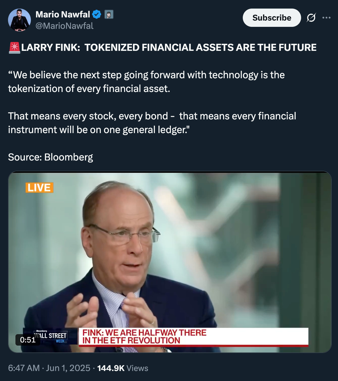 #our tokenized future is coming for all assets and Larry Fink at Blackrock driving this - lots of opportunity to provide infra (hello Blockdaemon), security and more to enable this - worth a 1min watch 👇🏻