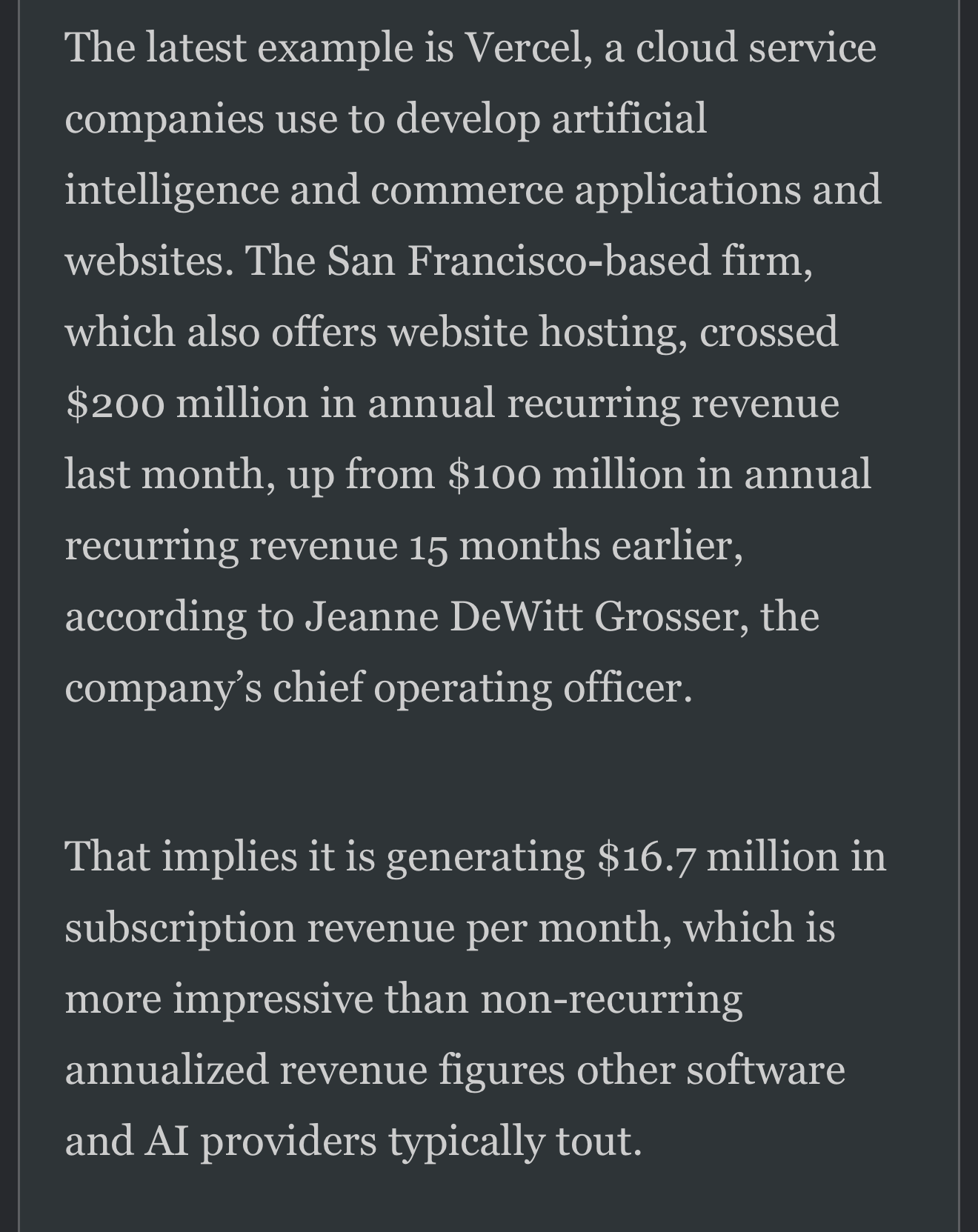 #speaking of Vercel - ARR doubled to $200m in 15 mos 📈 with hot AI customers like Decagon, Granola, Runway and others (The Information)
