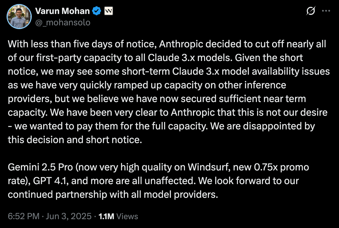 #not surprising given Windsurf being bought by OpenAI but alliances/battle line being drawn…tough when Windsurf and Claude was powerful combo