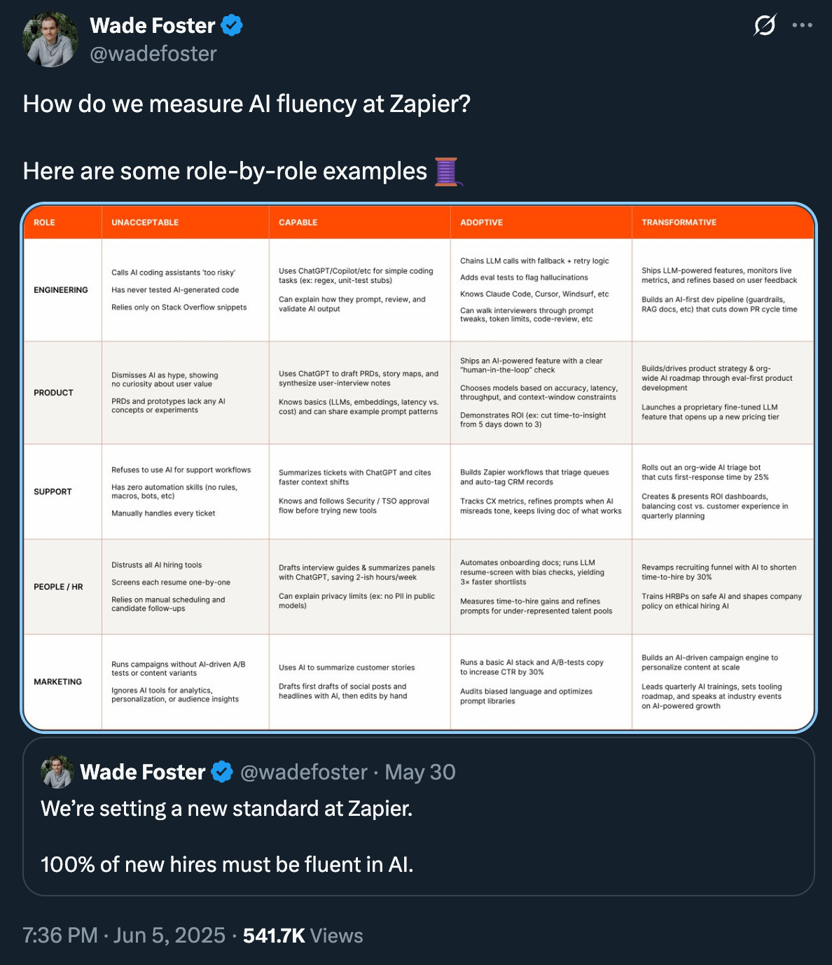 It’s a mindset and CONFIDENCE shift we’re also seeing in how companies like Zapier are rethinking their org design and hiring for AI fluency across the board (👇🏻 to see how Wade Foster’s qualifying for this).