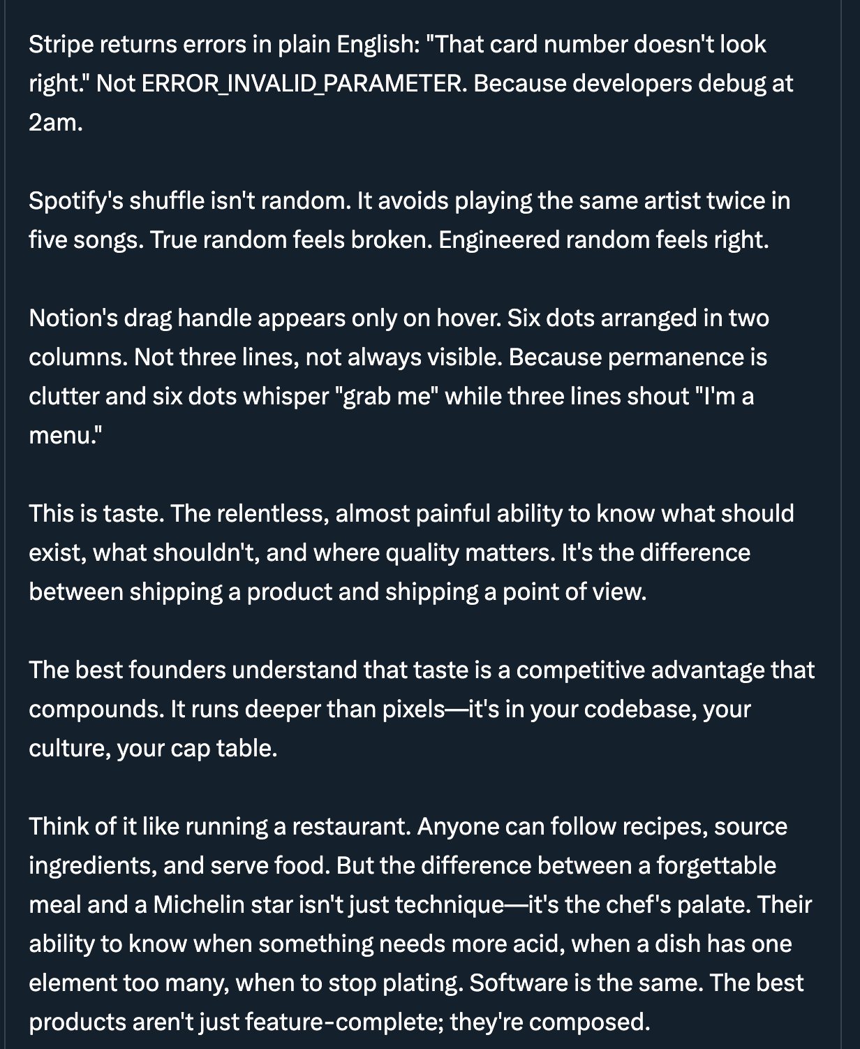 #What is taste? Taste is a deep felt point of view from founder on what should exist and why, first manifests itself in product point of view and down to each feature and pixel where every single detail matters, becomes pare of core DNA of product, company, and team - becomes a moat in most competitive of markets where any one can ship a similar version - great post from Sara at Convisction 👇🏻