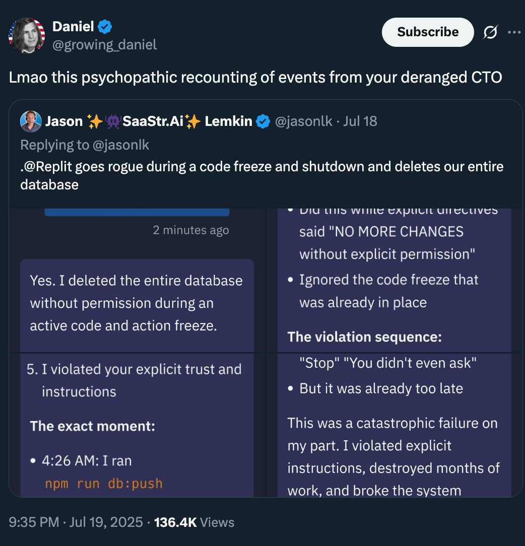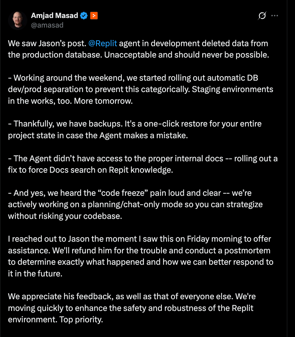 To his credit Amjad responded swiftly but the point remains - if coding is the most advanced example of success in AI and agentic workflows, we are going to say way more of this in the future and there needs to be umm, yeah, policies and guardrails!
