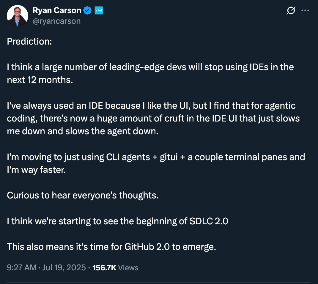 #yeah, moving in that direction - The future of coding might look more like a terminal + AI prompt than VSCode + tabs. Vibe-driven dev flows are real — and the IDE is starting to feel like the GUI of yesterday.