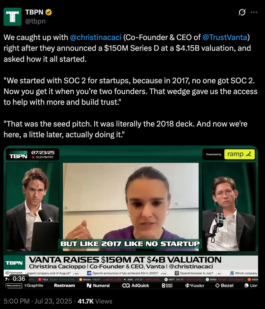 #lots of great businesses started with automating a spreadsheet - Vanta now worth $4.15B starting with that wedge - congrats to the team on simply amazing execution