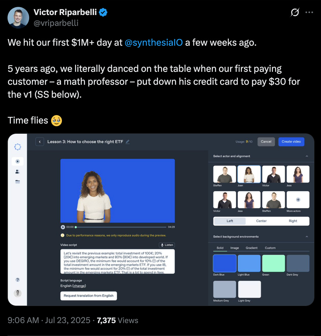 #👀 first $1M day for Synthesia - Create AI videos from text in minutes. Trusted by 50.000 companies like Amazon, Accenture, Reuters.