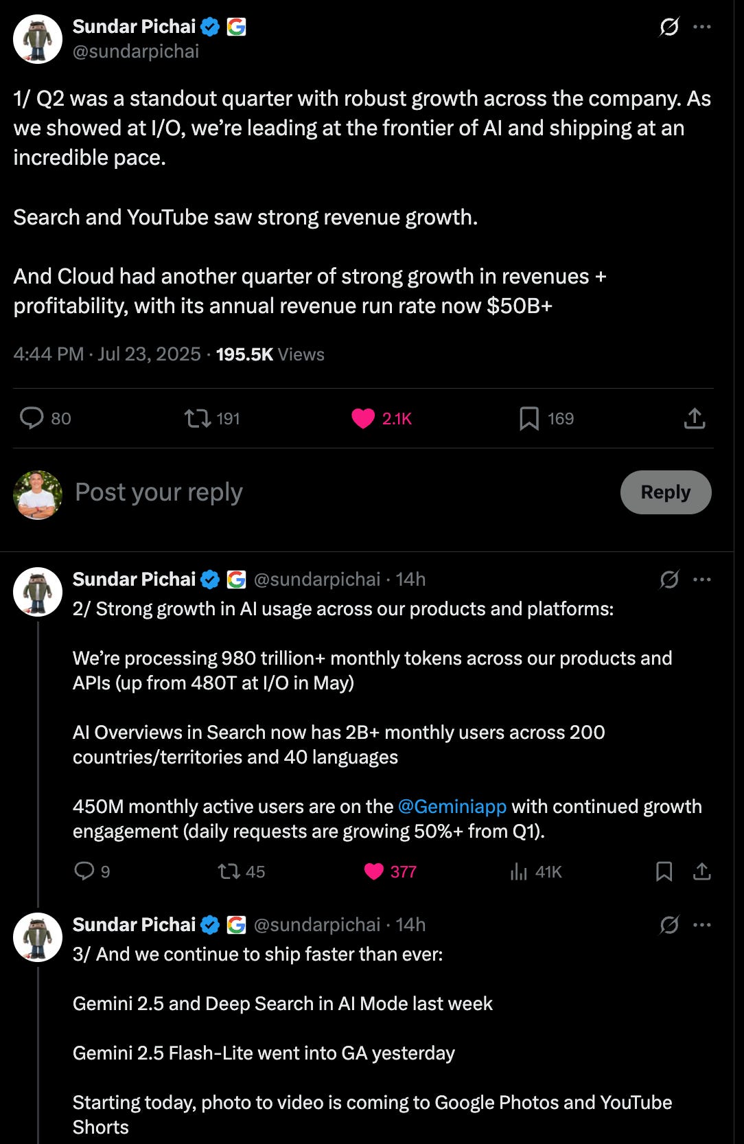 #is AI eating Google yet? Based on Sundar’s comments and results, the answer is no! Love “we continue to ship faster than ever”