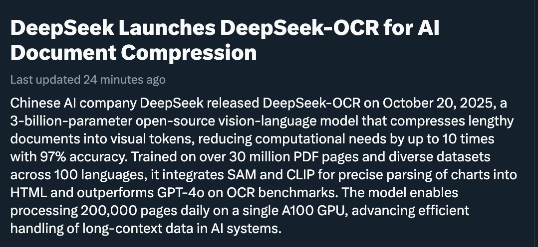 #major breakthrough from DeepSeek…again - turning text into vision tokens using fraction of tokens an LLM needs to realize 97% accuracy