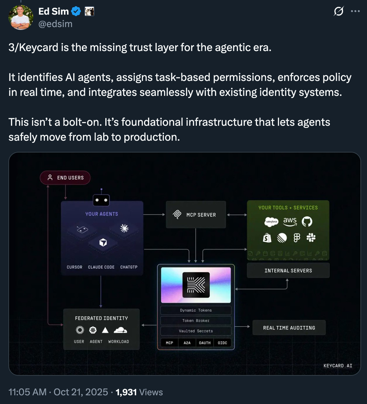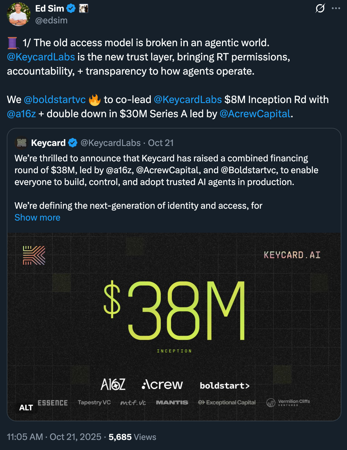 I’m biased, of course, as an investor in Snyk, but also one other company that generated a ton of buzz at the event, Keycard which just emerged out of stealth. I’m super fired 🔥 up to have led the Inception round with my friends at a16z and double down in the A with Acrew Capital who we also did Protect AI with.