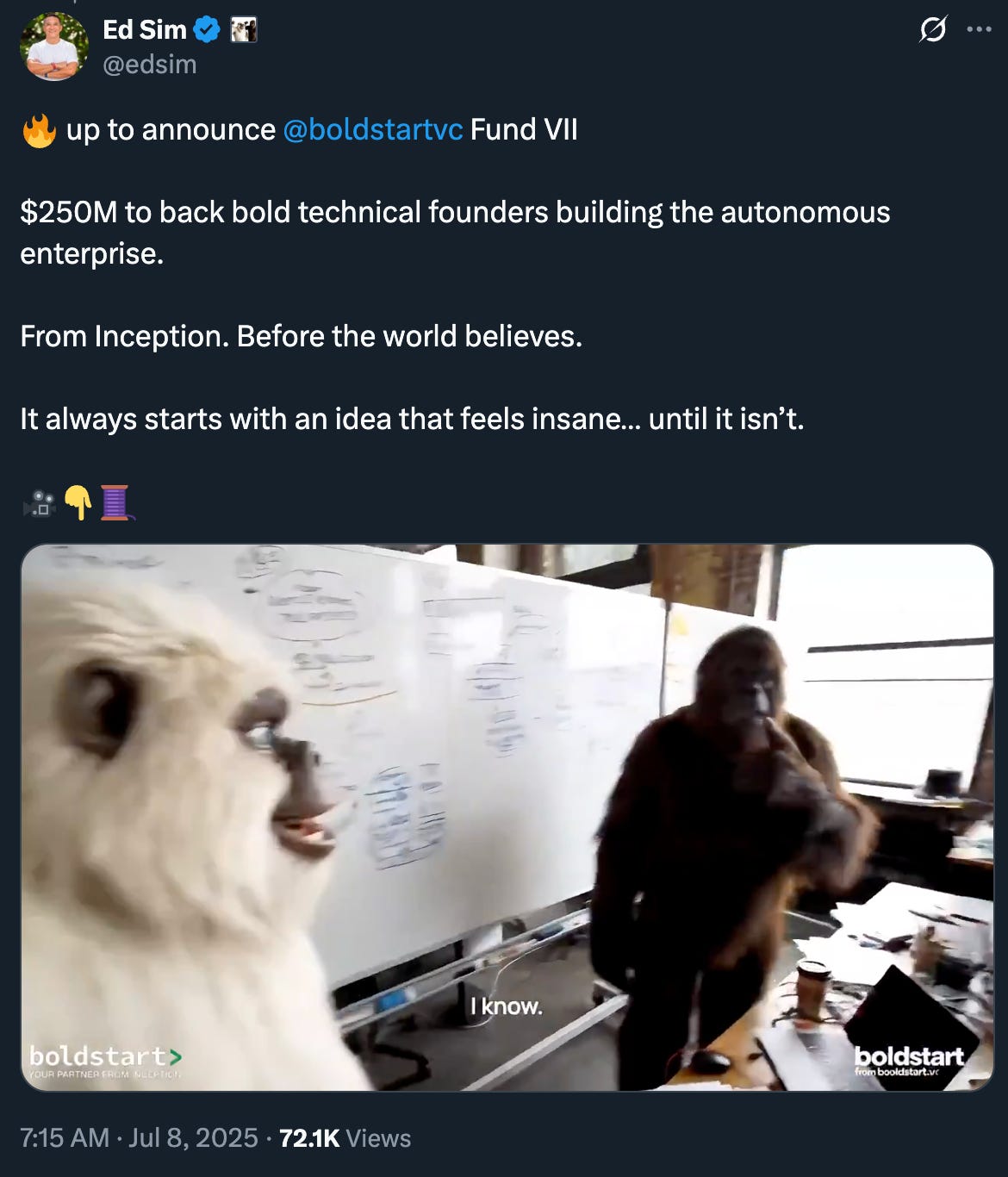 On the one hand, this can be incredibly bearish, but on the other hand, when you dig through what Karpathy is really saying, agentic workflows still can be beautiful, especially when paired with humans versus the promise of full autonomy. While current “agent” systems (as conceived) still have major gaps and the time-horizon for full autonomy is at least a decade away, there are still massive opportunities in human + agent collaborative workflows. I, for one, view the glass half full and believe we’re just early in the autonomous future, and there is so much to be built to get us ready as I highlighted in our boldstart fund vii announcement focused on the “autonomous enterprise” earlier this summer.