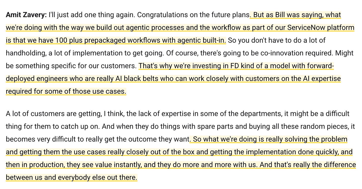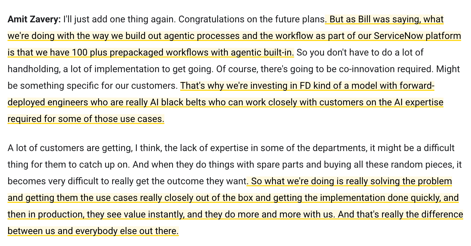Yes, not the prettiest, super complex, and yet, ServiceNow continues to crush earnings! It turns out that being the system of record, system of intelligence, or whatever you call it, a dumb database, is still a powerful moat, especially when tens of millions of dollars have been investing in application specific workflows. One other secret weapon for agentic sales has been its increasing use of FDEs. Yes, forward deployed engineers like Palantir and every other startup in AI because you guessed it, my mantra is coming - “the last mile in the enterprise is the longest.” Customers don’t have enough talent or expertise to just get it done and wants a product to deliver immediate time to value.