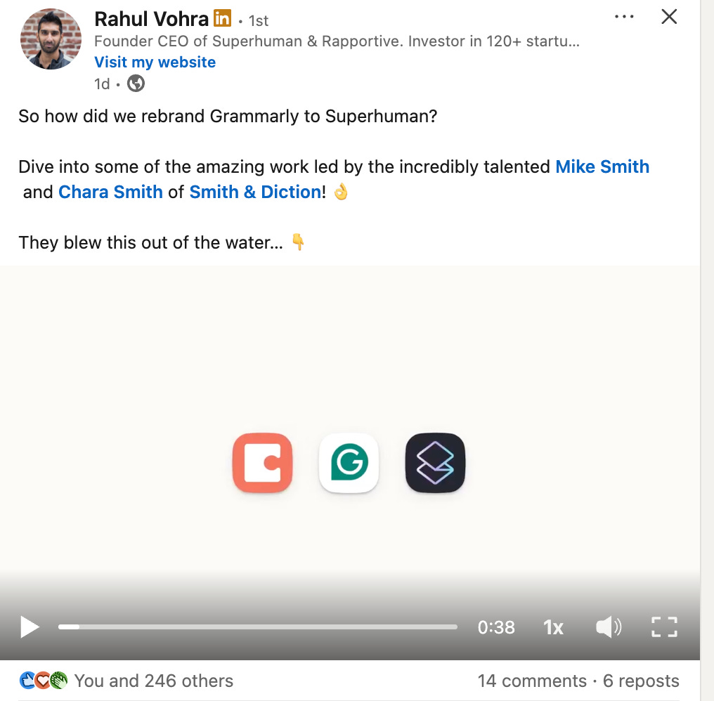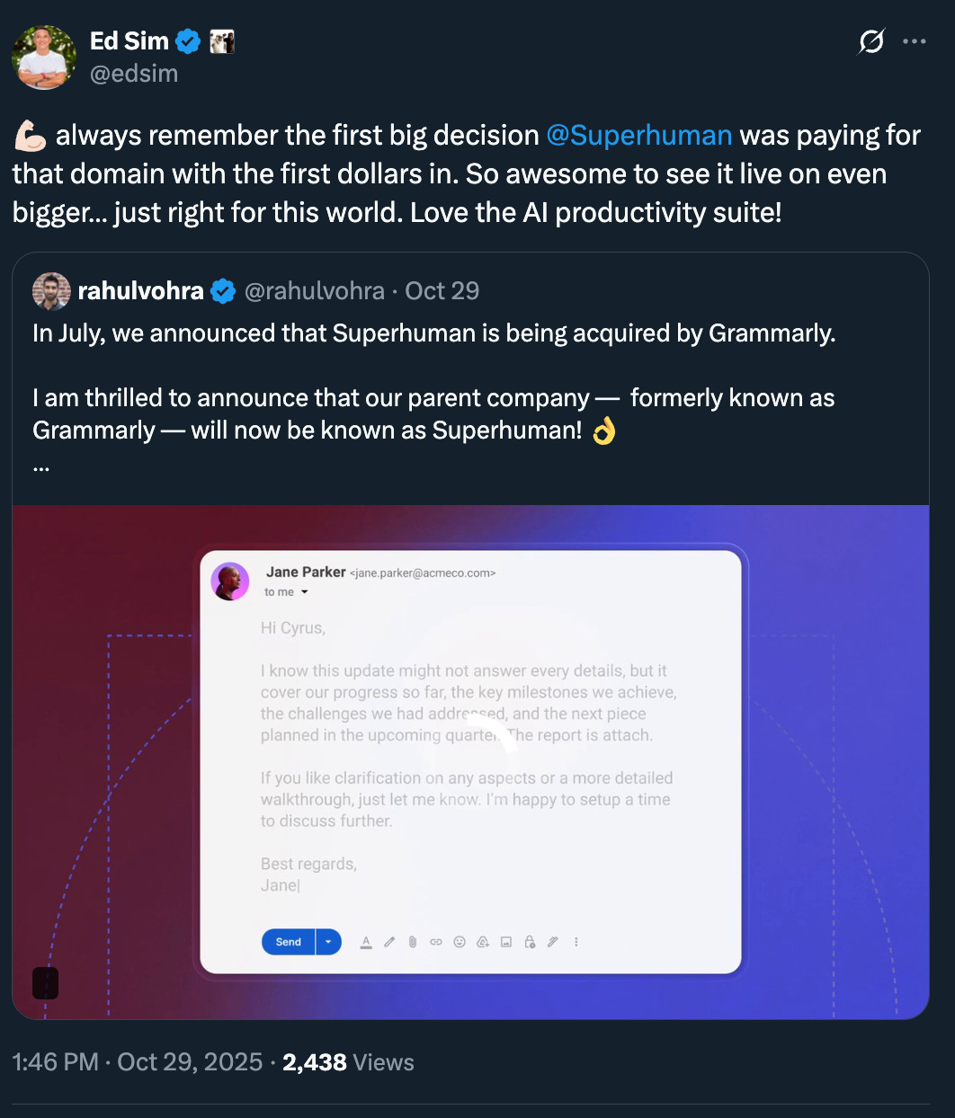 #pretty cool to see Superhuman live on as the “brand” for Grammarly and Coda with a $800M+ ARR and profitable business…I think we paid $50k for the domain