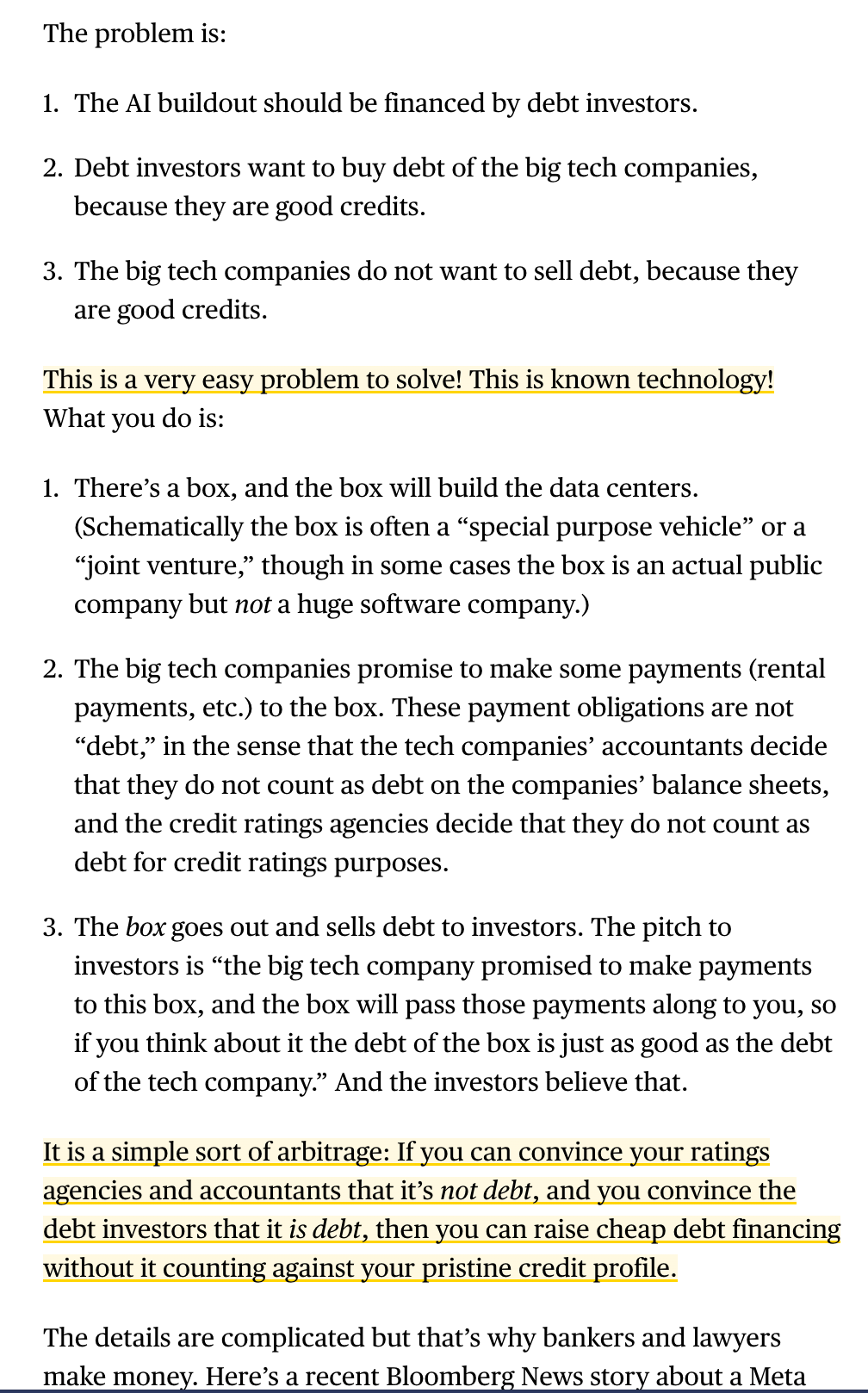 #how data centers need to be financed - equity too expensive, should be debt but…Matt Levine from Bloomberg 👇🏻