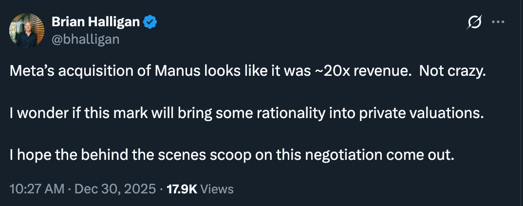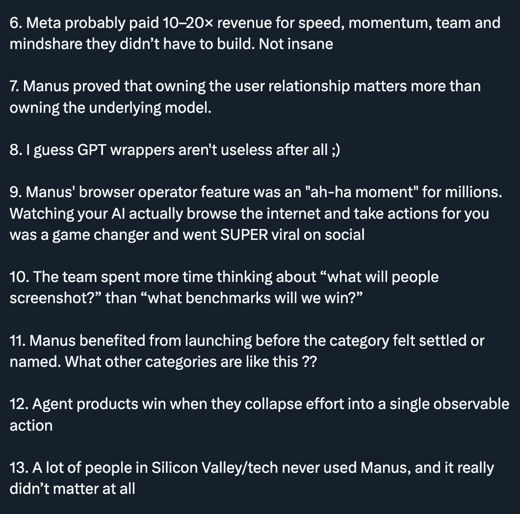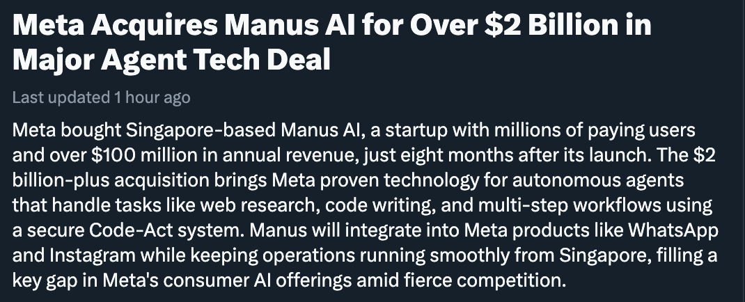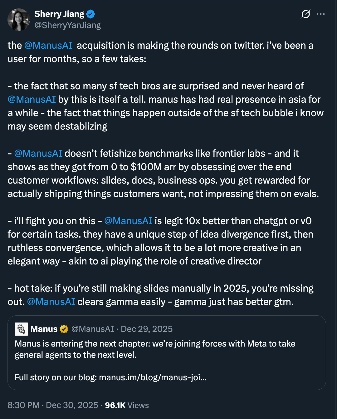 #Manus - Meta 🤯 - congrats to Benchmark on investing in this team from China who moved to Singapore and also signals that agents without a research lab can be incredibly valuable to acquirers 🤔