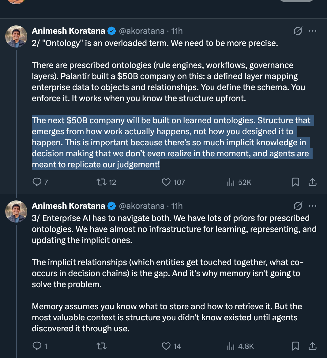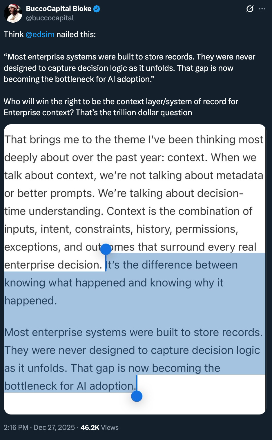 So agree with this from Animesh who wrote a follow up article to Jaya on How to Build a Context Graph. Point is we need a next-gen Celonis or FortressIQ, that is intelligent and learns and maps how people interact, what data flows, and map out workflows.