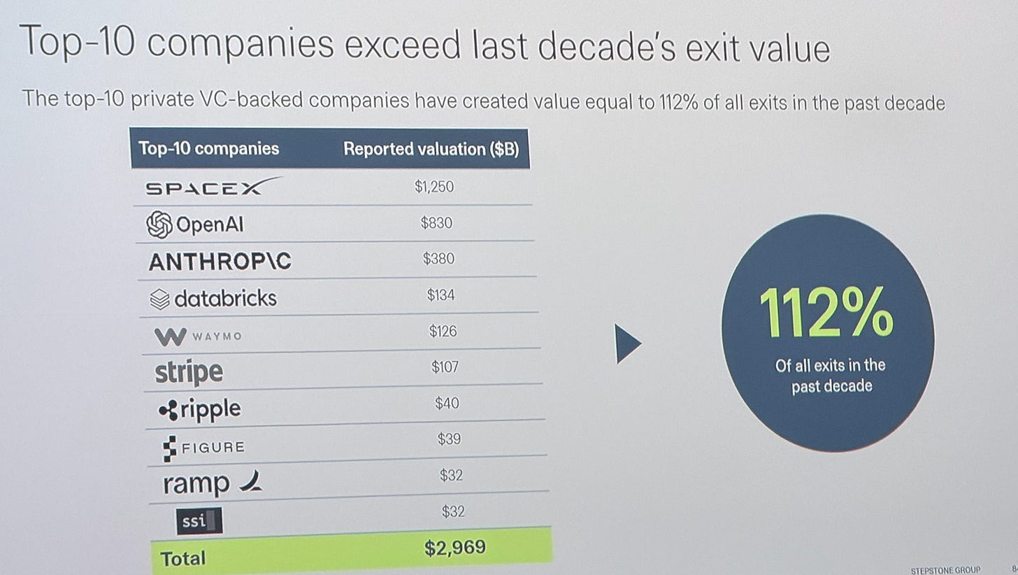 The top 10 private VC-backed companies have created value equal to 112% of all exits in the past decade. More than the entire decade of exits. Let that sink in