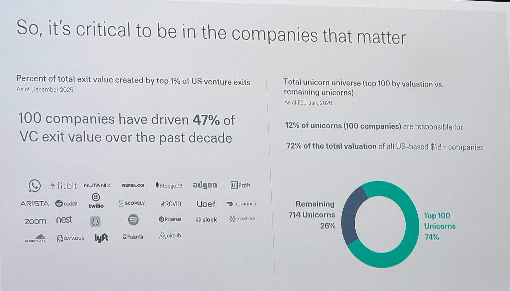 100 companies have driven 47% of all VC exit value over the past decade. 12% of unicorns (just 100 companies) represent 72% of total valuation of all US-based $1B+ companies