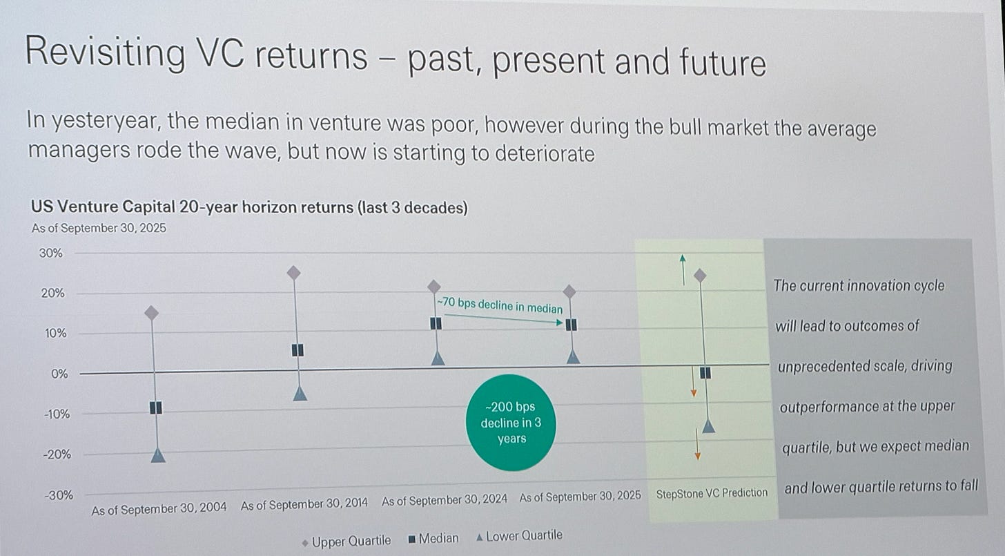 The 20-year return data tells the story. Median VC returns are drifting down, while the upper quartile will be extraordinary. Translation: most managers will struggle to return capital. A small group will generate generational outcomes.
