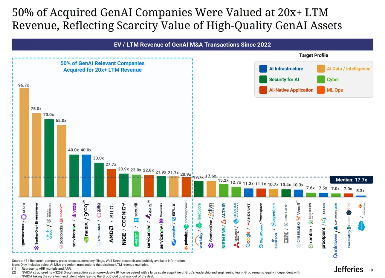 At roughly 22x annualized revenue, Cursor looks expensive by old SaaS rules. But the Jefferies data makes the deal feel less like an outlier: half of acquired GenAI companies since 2022 have sold for 20x+ LTM revenue. Scarcity value is real.
