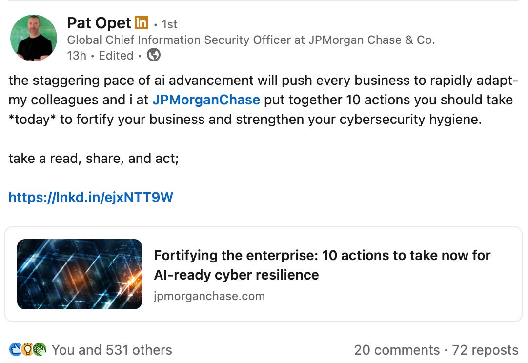 #must read for anyone in cybersecurity from CISO JPM with greater than $1B budget 🤯 - all about trying to reduce the vulnerability footprint as fast as possible before hackers can exploit them at record speed and lots more to do with security hygiene…